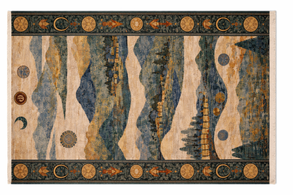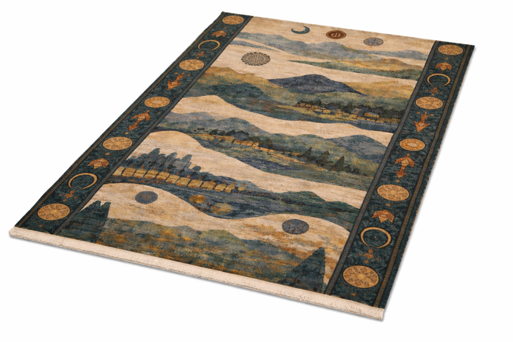Design: Abstract landscape–inspired hand-knotted design featuring layered mountains, flowing terrain, and symbolic motifs, framed with a decorative tribal border.